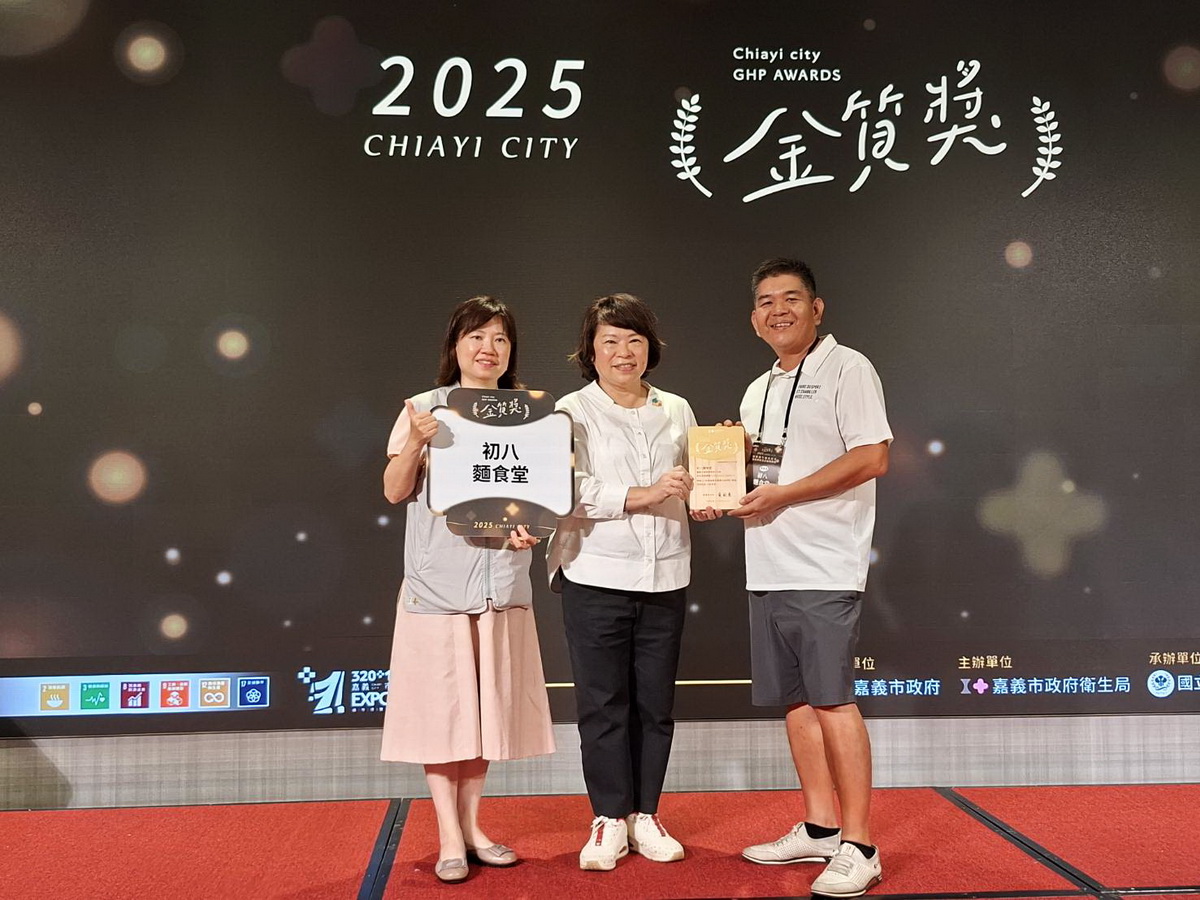 圖/嘉義市長黃敏惠(中)、由衛生局長廖育瑋(左1)頒發「金質獎」給得獎者初八麵食館老闆陳俊良(右1)。記者黃信峯攝