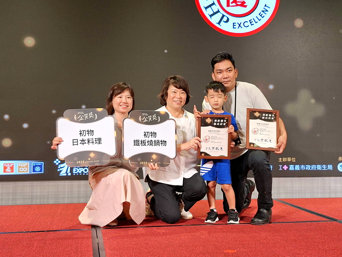 圖/嘉義市長黃敏惠(左2)、由衛生局長廖育瑋(左1)陪同頒發「金質獎」給得獎者初物鐵板燒鍋物主廚毛乃康。記者黃信峯攝