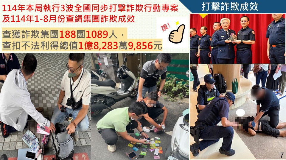 嘉義縣警察局為擴大民眾關注反詐議題及提升民眾識詐意識,今(25)日辦理「打擊詐欺犯罪成效破案記者會」,結合嘉義縣114年8月份詐欺情勢分析報告,彰顯警察局打擊詐欺集團決心與作為,亦向縣民宣導防詐意識重要性,提升縣民識詐意識,守護民眾財產安全。