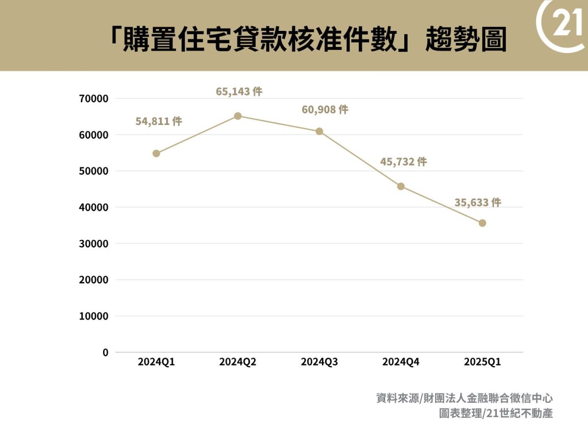 根據金融聯合徵信中心統計,2025年第一季全台「購置住宅貸款核准件數」約為3.5萬件,較前一季減少22%,年減幅高達35%。受利率走高、房價高檔與信用政策持續緊縮影響,購屋人入市意願疲弱,成交週期顯著拉長。