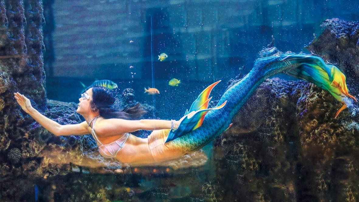 圖/10月10日至12日連續三天,在地下一樓中央水族廣場每天兩場「美人魚姐姐餵魚秀」,每天下午2點及晚上7點,邀您近距離欣賞美人魚姐姐的美妙泳姿。(大葉高島屋 提供)