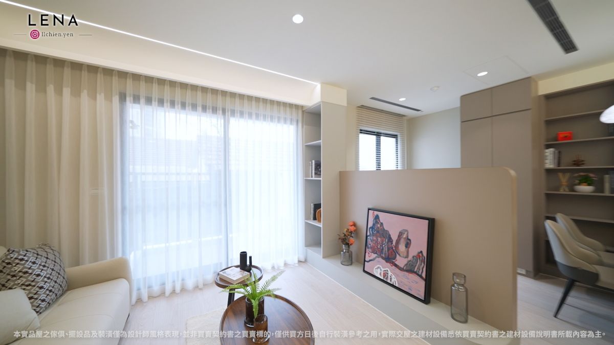 現場實品屋規劃為31坪2房2衛,次臥採開放式設計,搭配電視矮牆,提升整體空間感。全室鋪設德國太格木地板,開放式廚房配備Cleanup廚具、AMICA洗碗機與下拉籃設計,兼顧美感與實用性。衛浴採用V&B精品設備,並配有地暖與24小時緊急求助鈴,貼心考量家庭中長輩與孩童的安全需求。