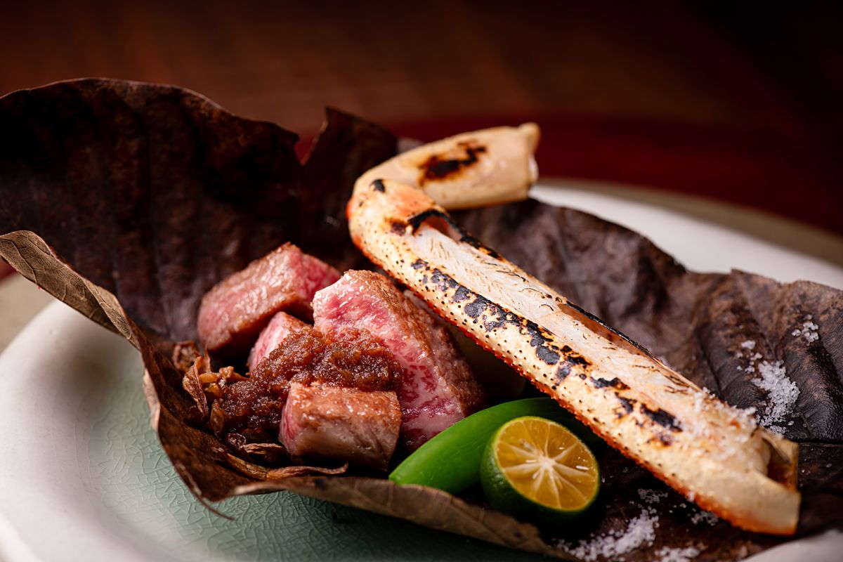 餐期的高潮,無疑是 「和牛松葉蟹朴葉燒」。選用北海道 A5 和牛搭配松葉蟹腳,以獨特的朴葉燻烤手法,讓蟹肉鮮香與和牛油脂在高溫下交織出迷人層次。牛肉的柔嫩口感與海味的鮮甜相互輝映,入口即是濃郁馥郁的冬日印象,堪稱本季最不容錯過的奢華代表作。