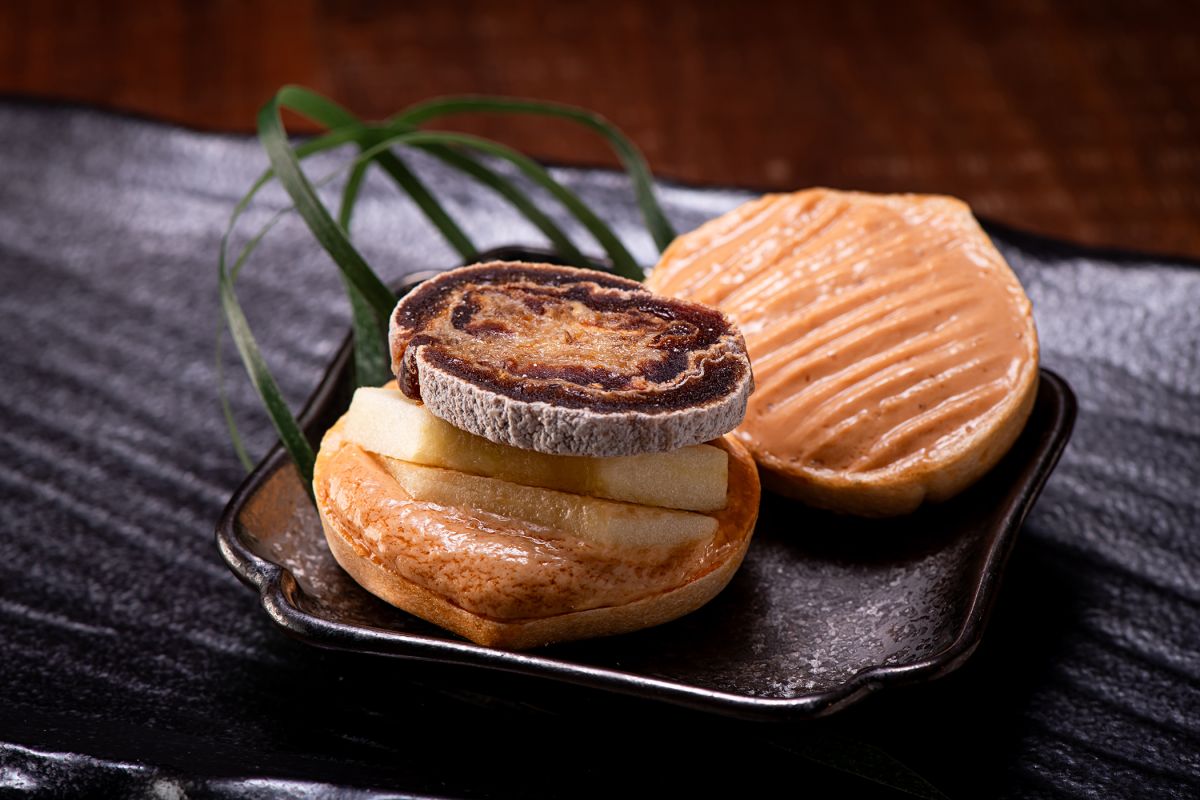 將日料經典「鮟鱇魚肝」化為冰淇淋,搭配最中餅的酥脆口感,呈現出鹹甜交錯的驚喜體驗。更以柿餅、蘋果片與客家金桔醬點綴,清爽果香與濃厚魚肝交織,顛覆傳統印象,創造出前所未有的和食創意。