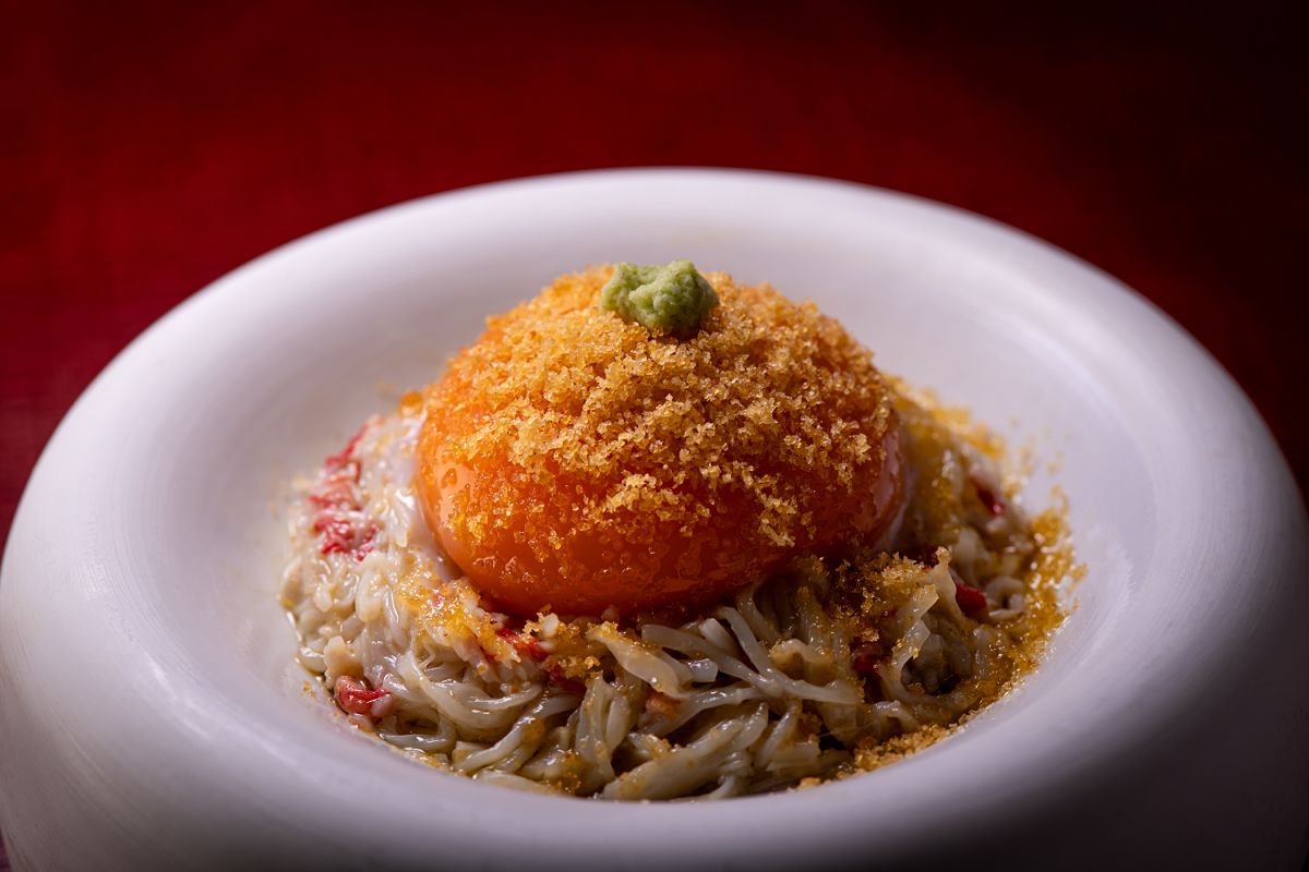 圖/「松葉蟹肉佐烏魚子粉與松露油封蛋黃」則以低溫熟成蛋黃結合蟹肉與烏魚子香氣,口感醇厚,帶來滿滿的冬季儀式感。( blu koi 提供)