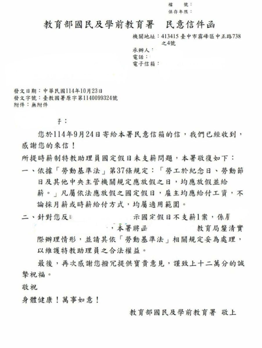 圖/國教署已經於今年十月函文明示,時薪制特教助理員適用勞基法第37條國定假日應支薪之規定。(新北市議員戴瑋姍提供)