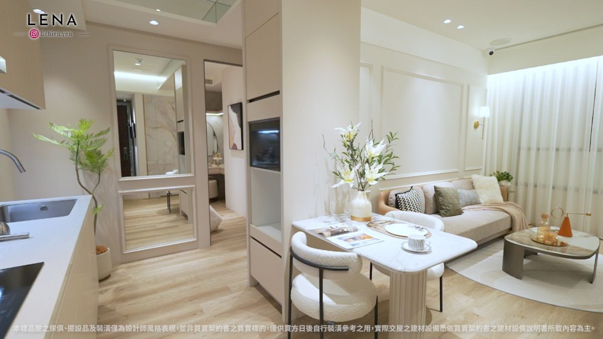 圖/29坪2房樣品屋。客廳寬約3.9米,雙窗採光明亮,附+1空間可隔作工作區;公私領域分明,提升居住舒適度。(翻攝 YT土地婆麗娜)