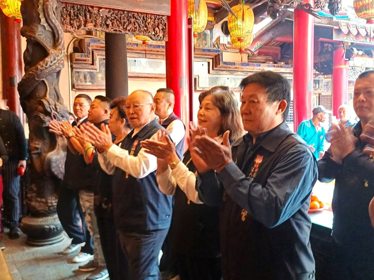圖/新港奉天宮董事⻑何達煌帶領董監事、誦經團長何許春蜜等祈求天上聖母保佑行程順遂平安。記者黃信峯攝