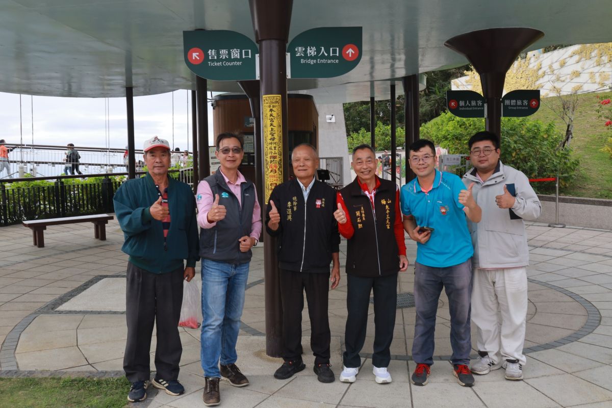 圖/新港奉天宮董事⻑總幹事李進興等於雲梯入口貼香條。記者黃信峯翻攝
