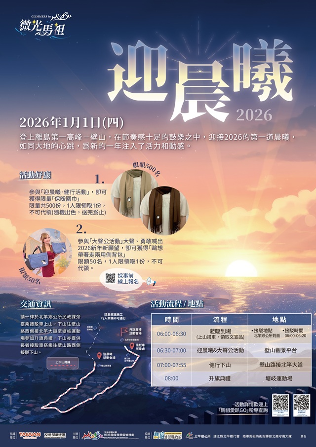 「2026微光馬祖-迎晨曦暨健行活動」由交通部觀光署馬祖國家風景區管理處(馬管處)結合北竿鄉公所、北竿鄉代表會、北高守備大隊等單位共同辦理,邀請民眾2026年1月1日前往離島第一高峰-馬祖北竿壁山迎晨曦,大聲喊出自己的新年願望與目標,再健行至塘岐運動場進行升旗典禮,讓新的一年挹注元氣與活力!現場除了準備文宣品要送給大家,還有行進鼓人Drumacue表演及大聲公迎晨曦活動,大聲公活動於12月8日(一)中午12點起開放報名,名額有限,歡迎大家踴躍參加。