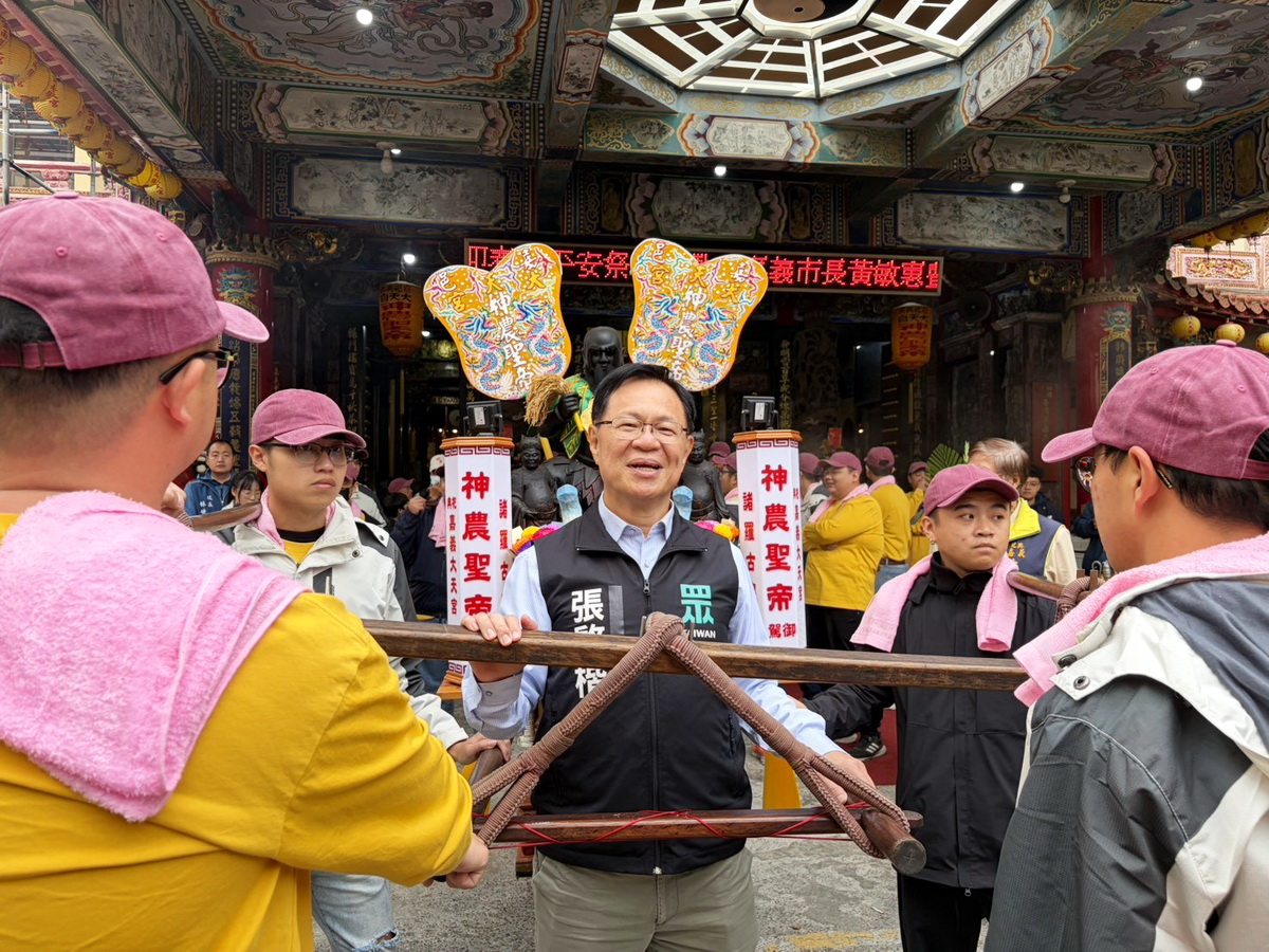 (記者黃信峯/嘉義報導)嘉義市「嘉邑祀典大天宮」,昨(7)日舉辦丙午年迎春平安祭典,神農大帝依循古禮出巡舊諸羅四城門。嘉義市長參選人張啓楷自上午八點起全程隨行參與遶境,並以扶轎方式一路陪同隊伍行走,直到晚間七點完成整段行,展現對地方信仰與傳統文化的重視,並祈願眾神護佑嘉義鄉土。