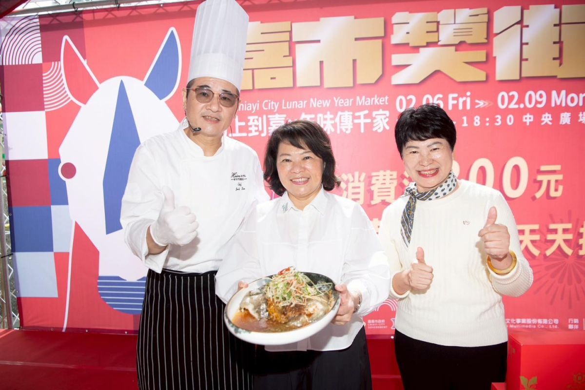 圖/嘉義市長黃敏惠於嘉義市年貨大街與新悦花園酒店劉映雪執行董事偕同主廚合影。記者黃信峯翻攝