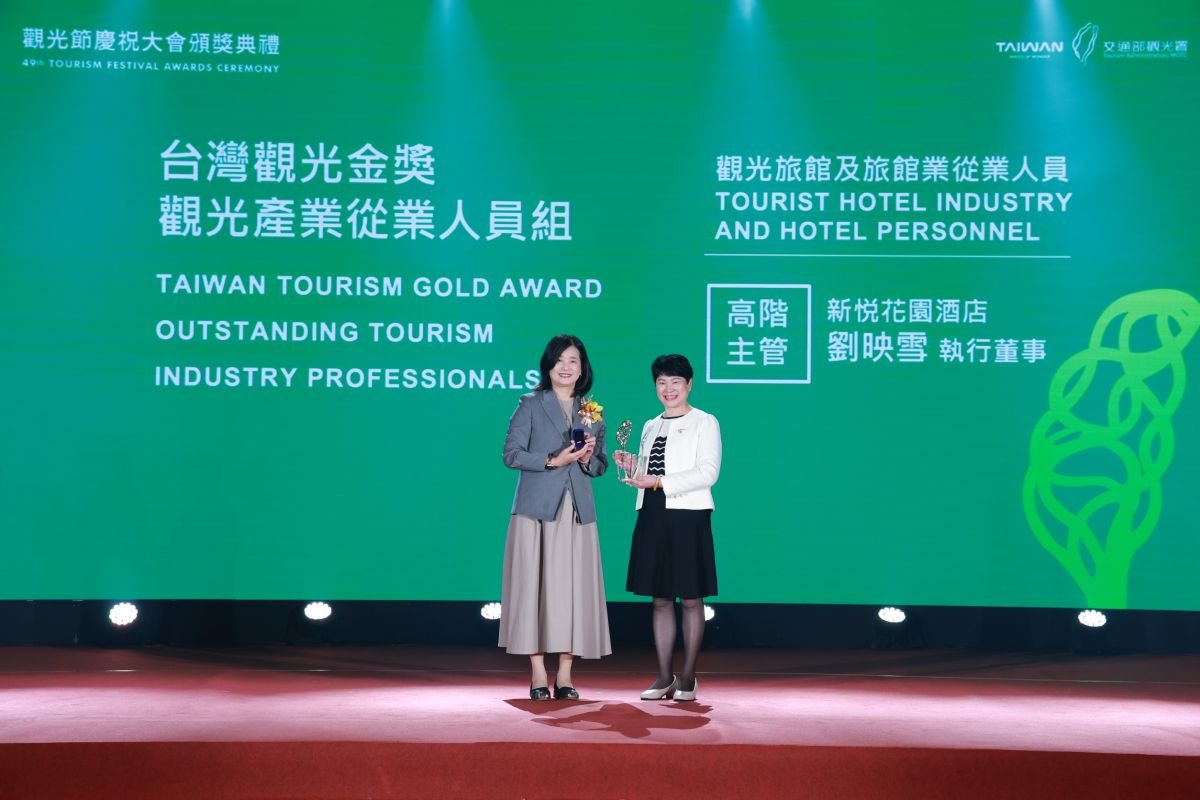 (記者黃信峯/嘉義報導)被譽為「觀光界奧斯卡」的「第三屆台灣觀光金獎」頒獎典禮日前盛大舉行,本屆共吸引全台357件案例角逐,競爭相當激烈,近年來,交通部觀光署積極推動「觀光永續」與「數位轉型」,並將相關成果列為本屆台灣觀光金獎的重要評選指標,新悦花園酒店執行董事劉映雪,憑藉多年深耕旅宿產業、積極推動觀光永續與產業轉型的卓越表現,榮獲個人最高榮譽「台灣觀光金獎」,成為本屆備受矚目的得主之一。
