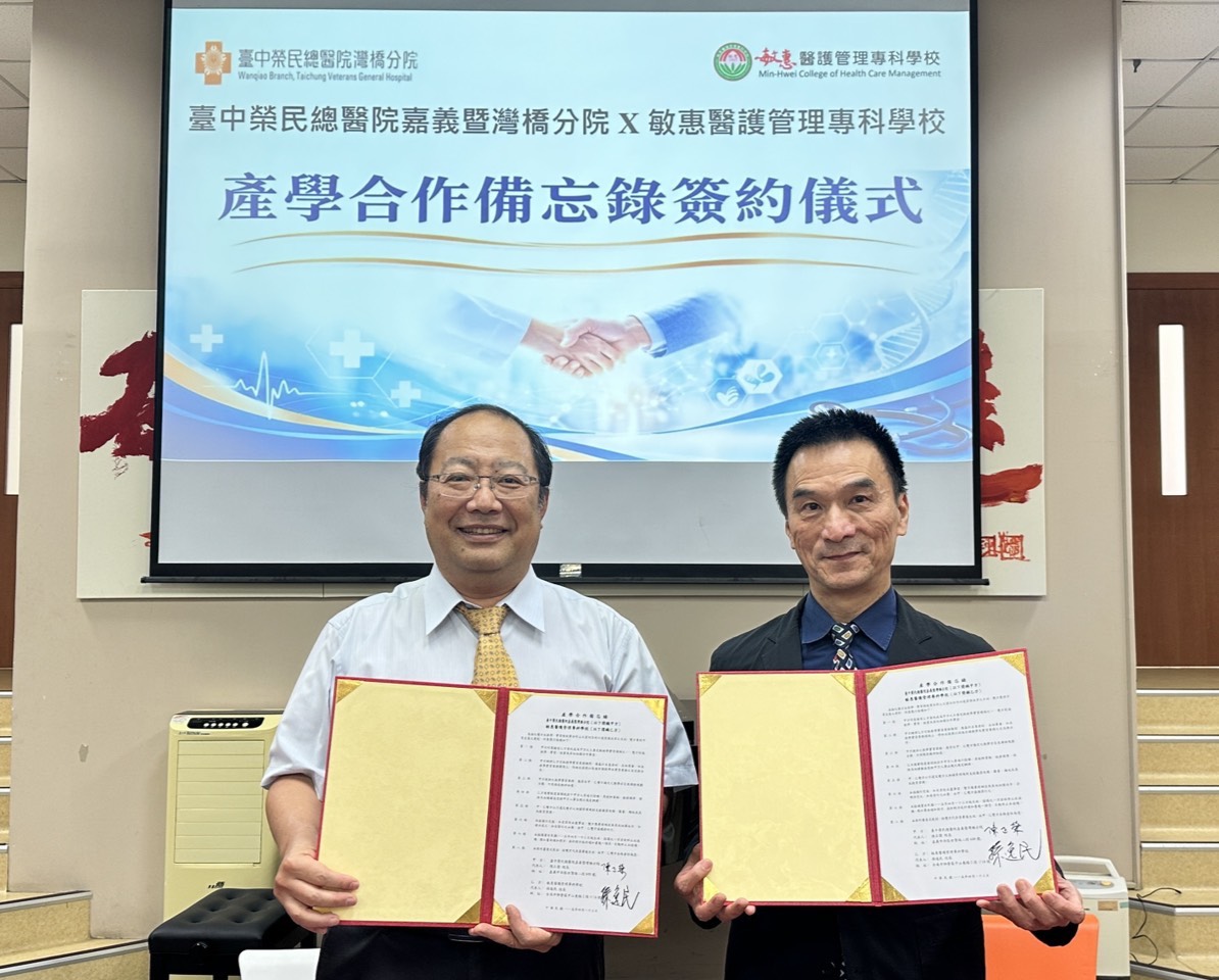 (記者黃信峯/嘉義報導)臺中榮民總醫院嘉義分院持續深化產學合作布局,繼與長庚科大及崇仁醫護學校合作後,今(13)日再與敏惠醫護管理專科學校簽署合作備忘錄(MOU),逐步建構涵蓋不同學制的護理與長照人才培育體系,為因應高齡社會照護需求提前布局;簽約儀式於敏惠醫專舉行,由臺中榮總嘉灣分院院長陳正榮率領護理部團隊,與敏惠醫專校長孫逸民代表簽署,象徵雙方合作關係再升級。