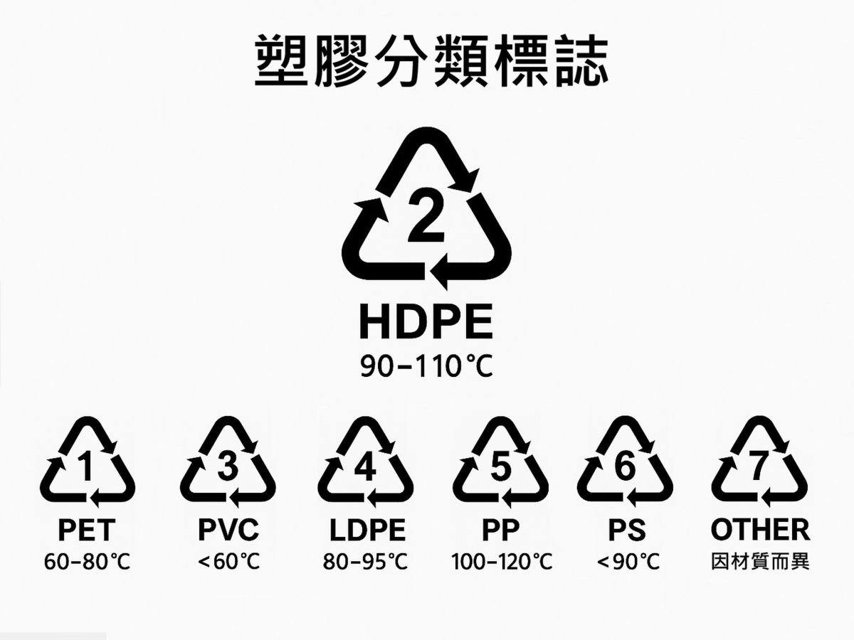 塑膠並非單一物質,而是包括PET、HDPE、PVC、LDPE、PP、PS及其他合成樹脂等七大類。它們的耐溫與耐化學性各異,外觀上難以單憑目視辨識,若未正確使用,確實可能因添加塑化劑影響飲食安全。因此,國際間制定了「塑膠分類標誌」(1至7號編碼),幫助消費者快速識別材質,正確選擇合適的塑膠容器。