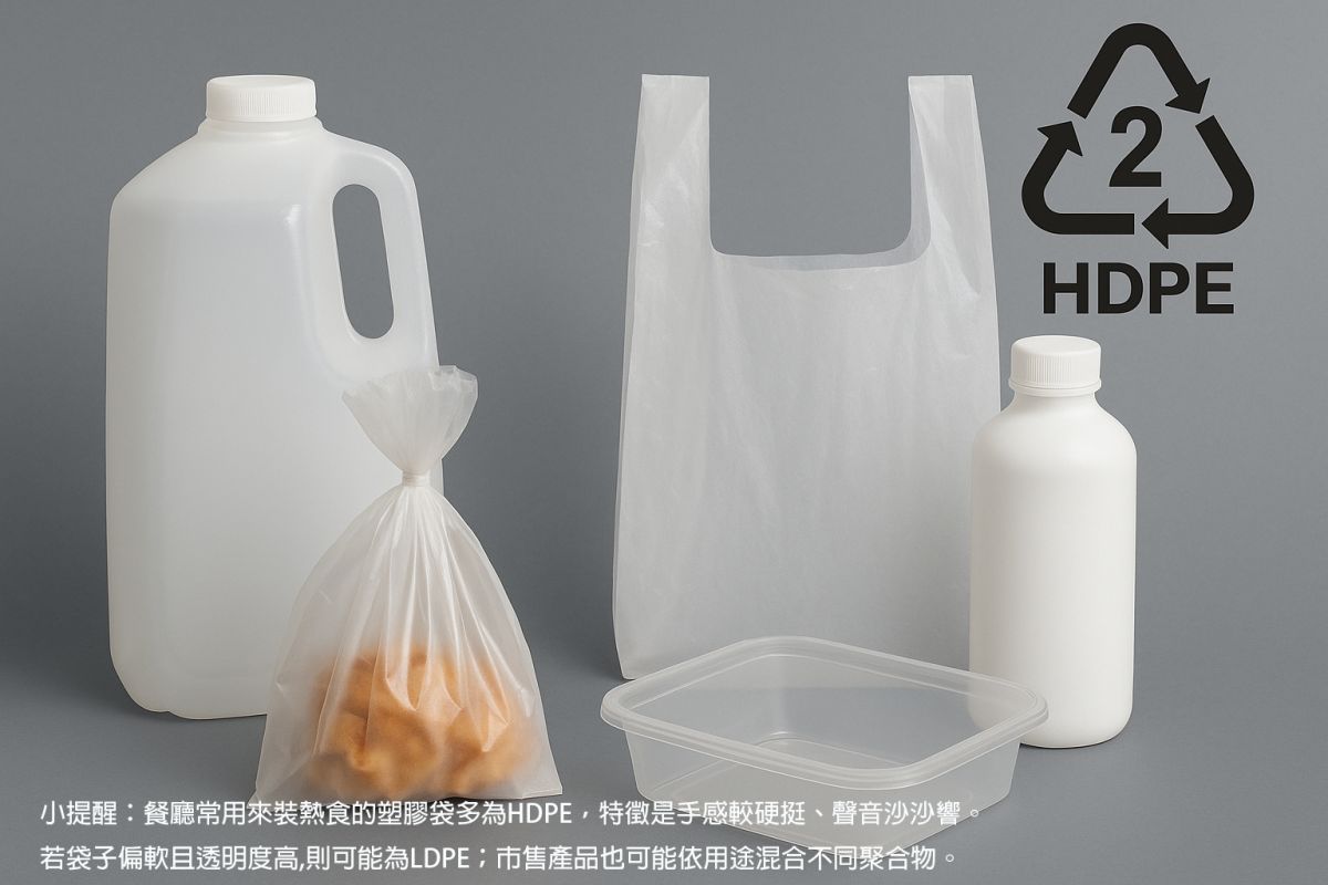 在了解不同塑膠材質的差異後,民眾在日常生活中也能用簡單方式判斷外帶包材是否為較安全的材質。建議可先查看容器或袋子底部是否有標誌;若沒有標示,HDPE 塑膠袋通常帶有霧白色澤、質地偏硬,輕拉會有「沙沙聲」。短時盛裝熱食時,HDPE 可維持穩定結構,成為日常可靠的熱食容器或包材之一。