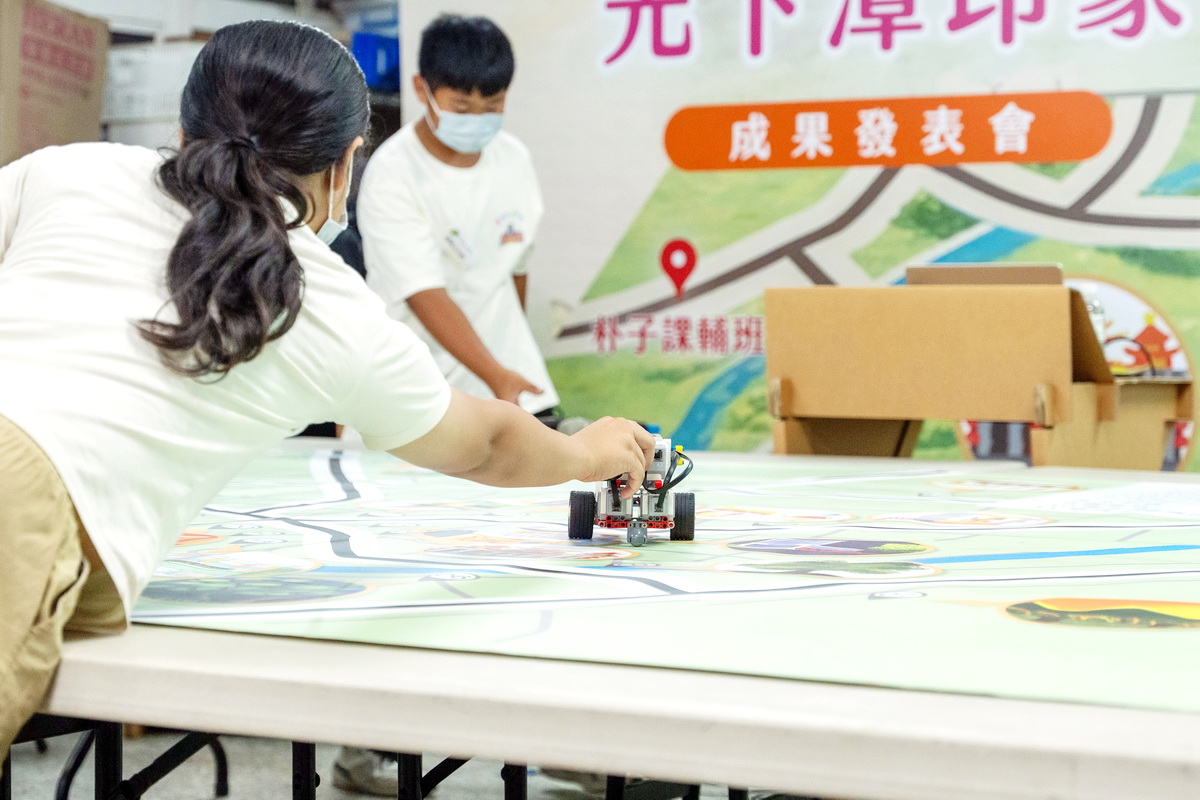 基金會偏鄉兒童課輔班從103年成立至今已邁入第12年,這次成果展在吉富公益慈善基金會的支持下,讓偏鄉孩子們不只是坐在教室,而是先跟著導覽員沈幸正與柯博翔,頂著烈日踏查鹿草下潭,用雙腳感觸家鄉。再結合EVO03機器人的程式編寫、親手撰寫指令,讓機器人化身為導覽員,走進社區地圖中。當發現機器人走得路線不對時,孩子們會一起討論「是哪裡出錯了?」再思考修正的方向。